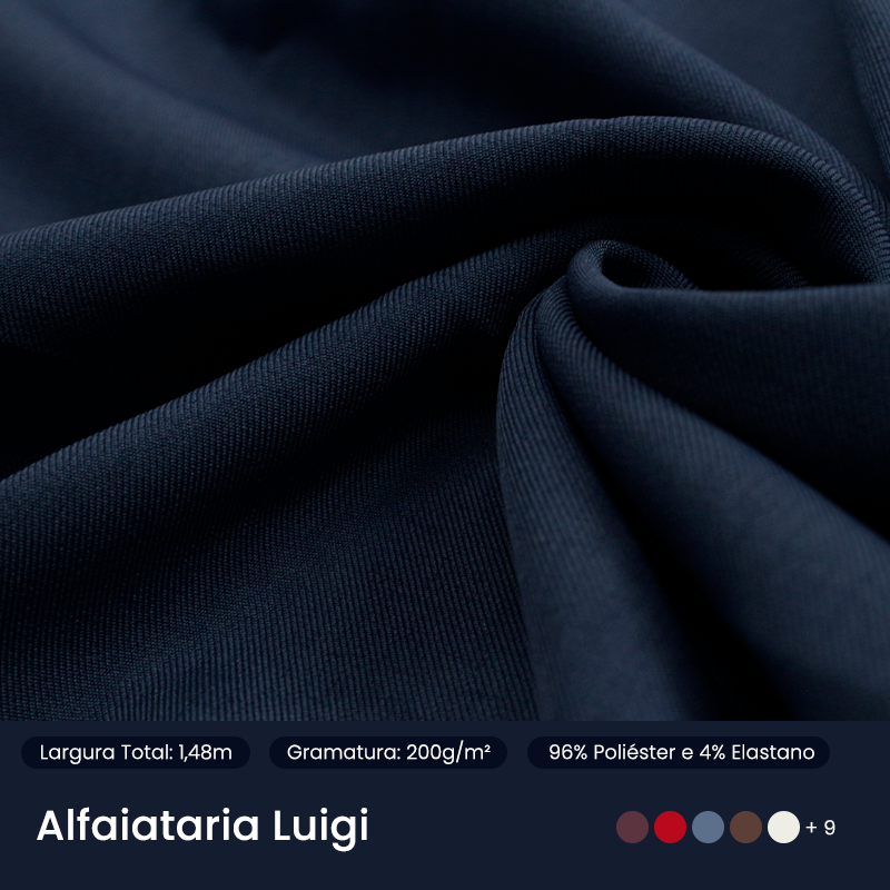Tecido versátil, que une construção em sarja, caimento encorpado, boa elasticidade e toque macio. Ideal para peças de alfaiataria contemporânea, com foco para peças de uso diário. Conhecido também como “Luís Twill” ou “Alfaiataria Luís”.