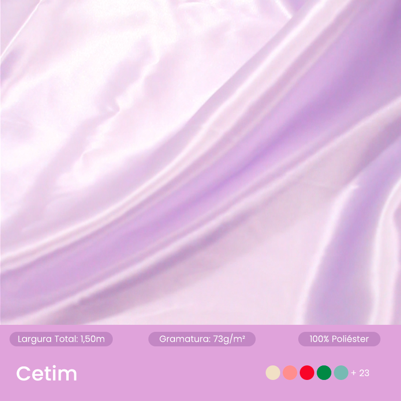 Tecido plano de alto brilho e toque acetinado, com caimento leve e flexível que valoriza drapeados, babados e volumes nas fantasias. Versátil, aceita sublimação e bordados, possui secagem rápida e ampla cartela de cores que atendem as mais variadas fantasias.