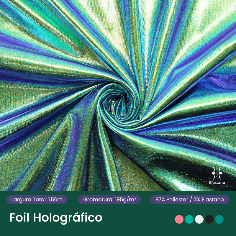 Malha com efeito furta-cor em toda a superfície, que reflete diferentes tonalidades conforme a luz, proporcionando brilho e personalidade às produções carnavalescas.
