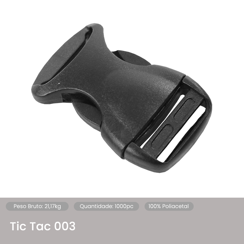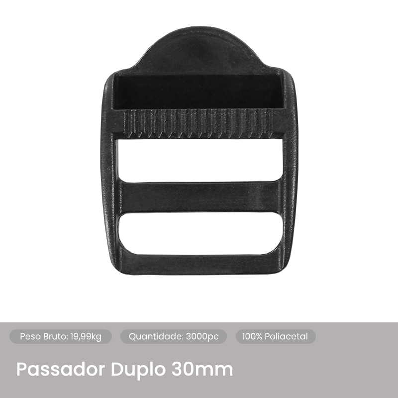 Disponível em versão simples ou dupla, tem a função de ajustar a altura ou o comprimento de alças em mochilas, bolsas e malas. Fabricado em poliacetal de alta qualidade, contribui para uma estrutura mais resistente e durável em comparação a outros plásticos.