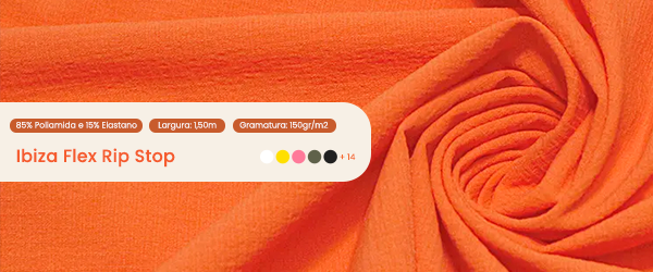 O Ibiza Flex Rip-stop é um tecido esportivo com poliamida e elastano, resistente à água, com elasticidade e visual urbano para peças funcionais.
